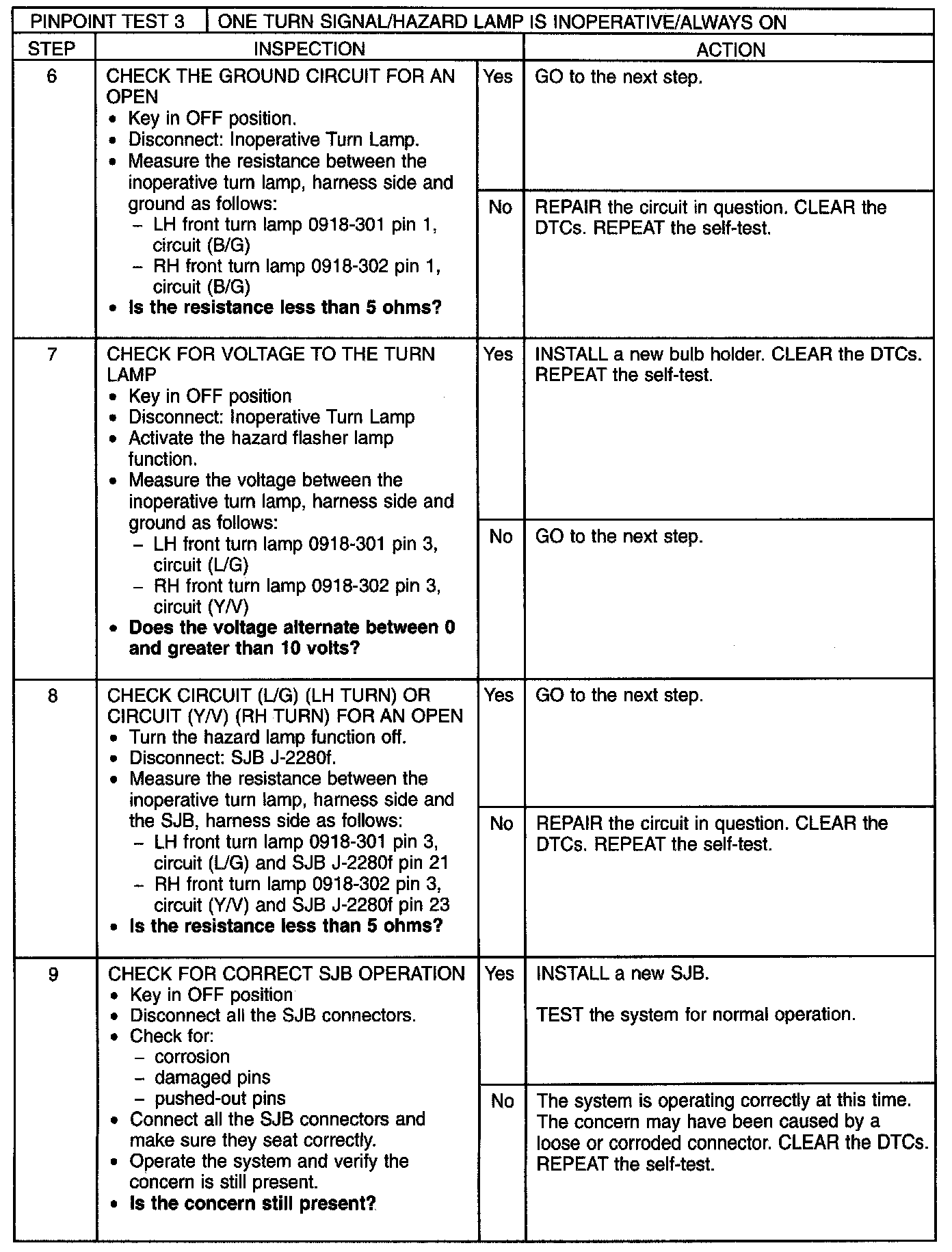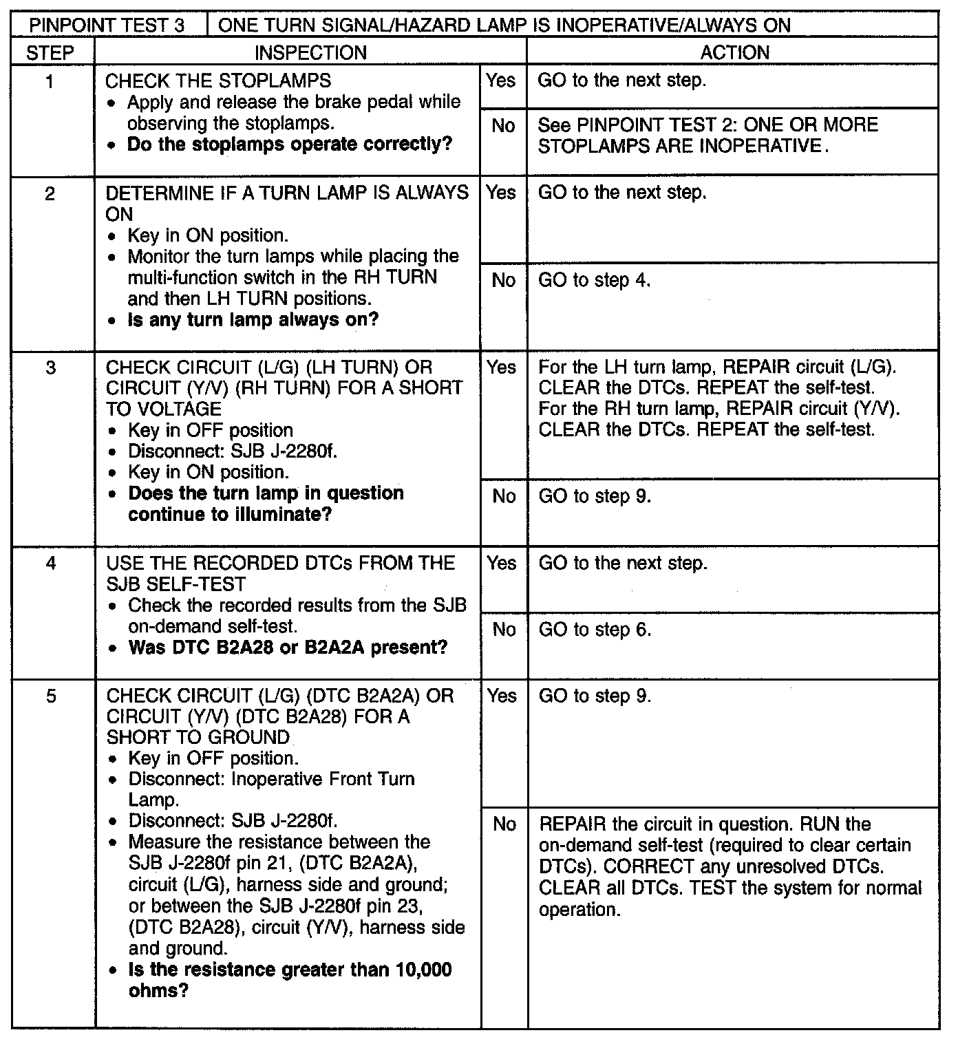 When the smart junction box (SJB) detects the multi-function switch in the LH TURN position, the SJB provides voltage through circuit (L/G) to the LH front turn lamp. When the SJB detects the multi-function switch in the RH TURN position, the SJB provides voltage through circuit (Y/V) to the RH front turn lamp. Circuit (B/G) provides ground. The rear turn lamps are controlled utilizing the rear stoplamp circuitry.