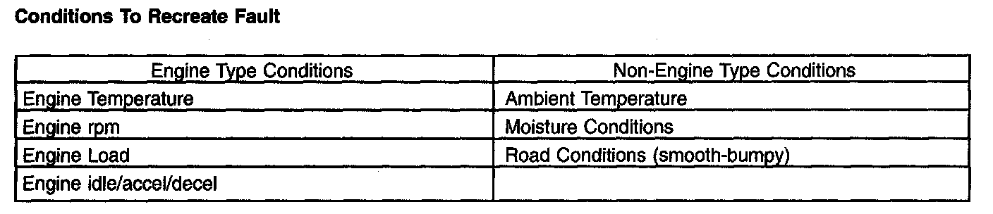 Recreating the concern is the first step in isolating the cause of the intermittent symptom. A thorough investigation should start with the customer information worksheet located in the back of this manual. If freeze frame data is available, it may help in recreating the conditions at the time of a malfunction indicator lamp diagnostic trouble code (MIL DTC). Listed below are some of the conditions for recreating the concern: