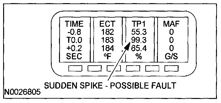 Scroll through the PID data while analyzing the information. Look for sudden drops or spikes in the values. (Refer to the following TP1 example). Notice the major jump in the TP1 voltage while scrolling through the information. This example would require a smooth and progressive accelerator pedal travel during a key on and engine off mode.