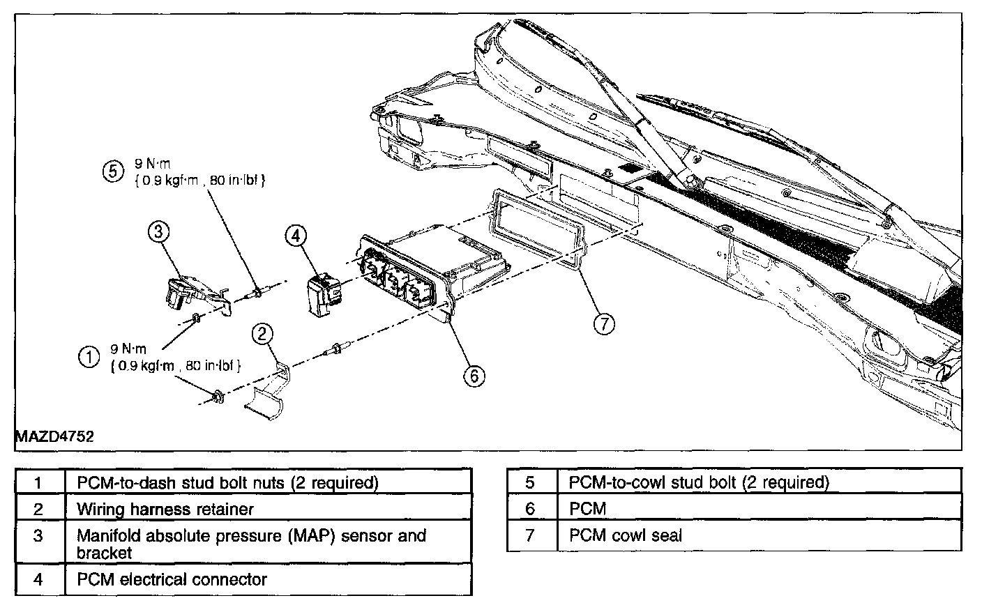 - To install, tighten to 9 N.m {0.9 kgf.m, 80 in.lbf}.