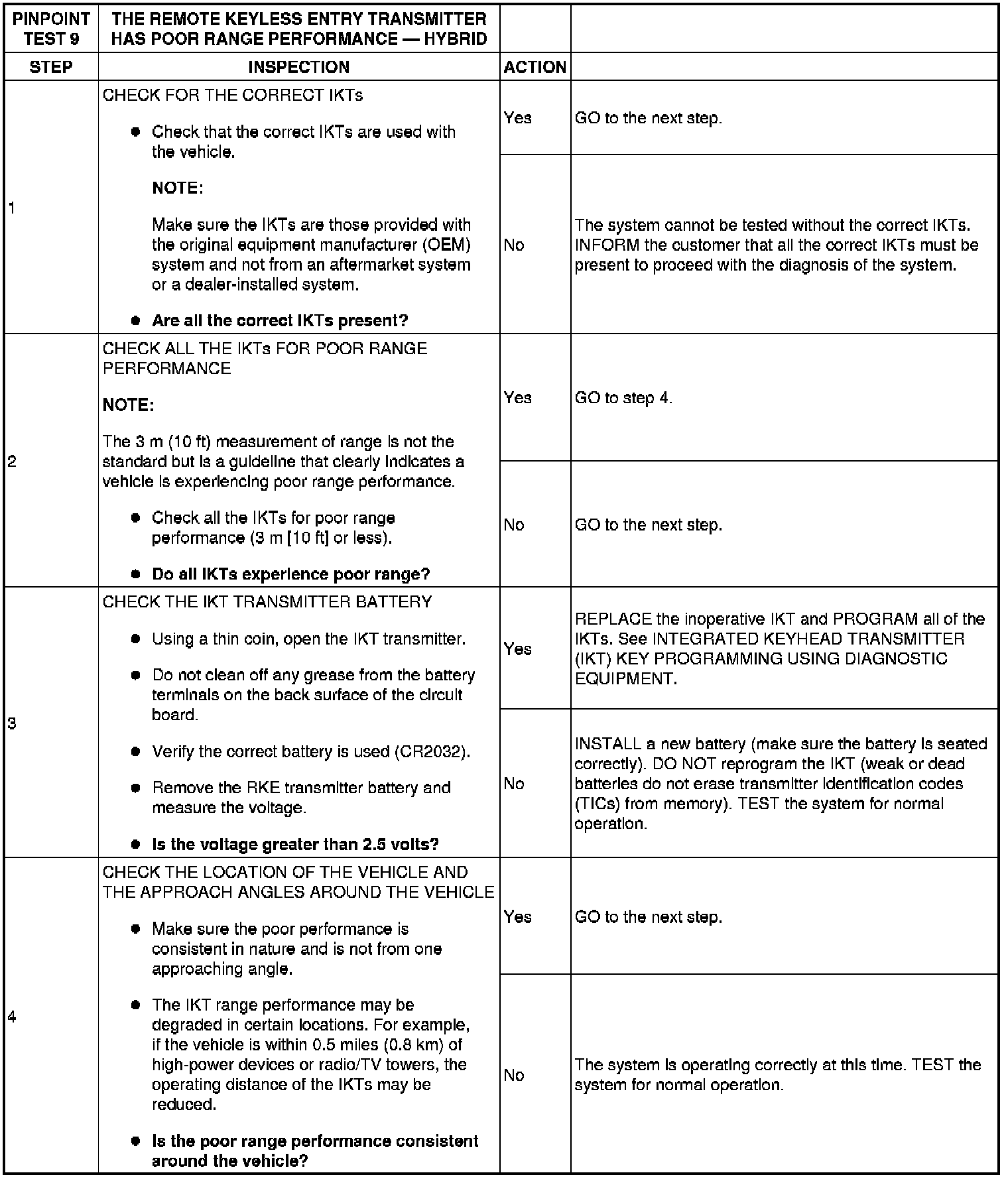 PINPOINT TEST 9: THE REMOTE KEYLESS ENTRY TRANSMITTER HAS POOR RANGE PERFORMANCE - HYBRID