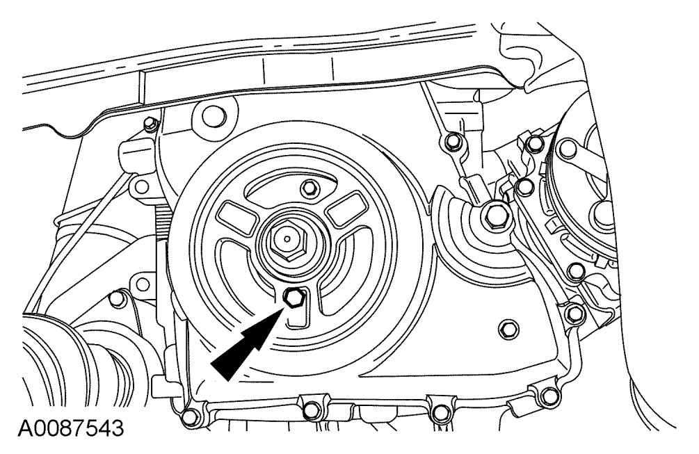 9. Install a standard 6 mm (0.23 in) x 18 mm (0.7 in) bolt through the crankshaft pulley and thread it into the front cover.