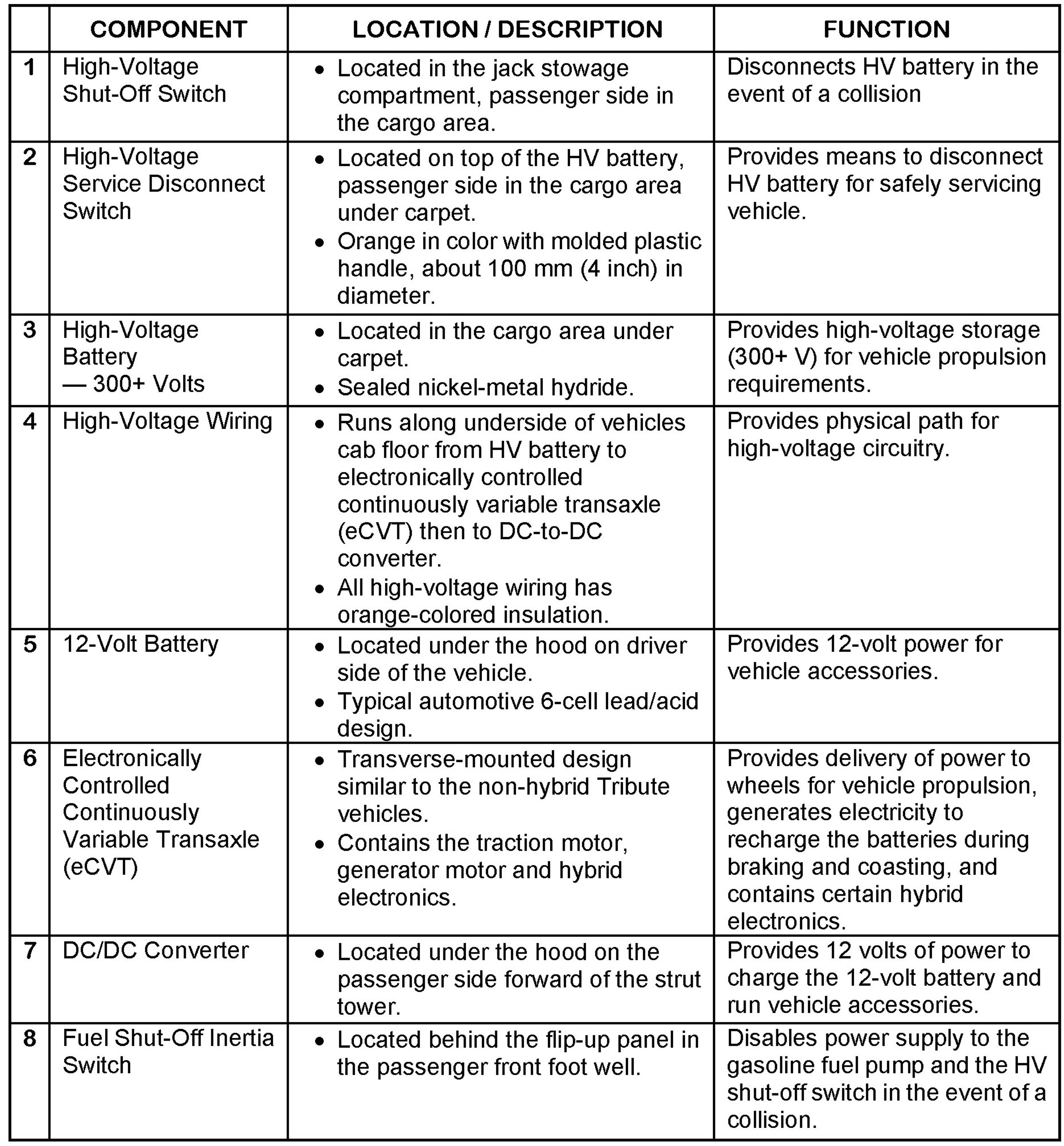 This chart provides the location, description and basic function of the hybrid system components. Refer to the component location illustration.
