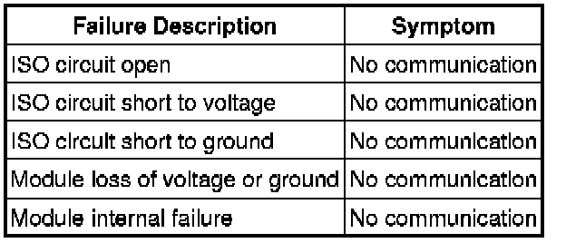 The ISO 9141 communications network is a single wire network. The ISO communications network does not permit intermodule communication and is only used for the parking aid module. When the scan tool communicates with the parking aid module, the scan tool must request all information, the module cannot initiate communications.The ISO network operates at a maximum data transfer speed of 10 Kbps for bus messages and is designed for scan tool to module diagnostic use only.The following fault chart describes the specific ISO 9141 network failures and their resulting symptom:ISO 9141 Network Communication Fault Chart