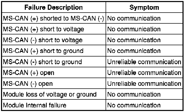The MS-CAN network uses an unshielded twisted pair cable of data (+) and data (-) circuits. The data (+) and the data (-) circuits are each regulated to approximately 2.5 volts during neutral or rested network traffic. As bus messages are sent on the data (+) circuit, voltage is increased by approximately 1.0 volt. Inversely, the data (-) circuit is reduced by approximately 1.0 volt when a bus message is sent. Multiple bus messages can be sent over the CAN circuits allowing multiple modules to communicate with each other. The MS-CAN is used for the instrument cluster, the front controls interface module (FCIM), the front display interface module (FDIM), the electronic automatic temperature control (EATC) module, the audio control module (ACM), the satellite digital audio receiver system (SDARS) module and the smart junction box (SJB) communications, and is designed for general information transfer. The MS-CAN network will not communicate while certain faults are present, but will operate with diminished performance with other faults present. The MS-CAN bus may remain operational when 1 of the 2 termination resistors are not present.The MS-CAN network operates at a maximum data transfer speed of 125 Kbps for bus messages and is designed for general information transfer. The network will remain operational, but at a degraded level when certain circuit faults are present.The following fault chart describes the specific MS-CAN network failures and their resulting symptom:MS-CAN Network Communication Fault Chart