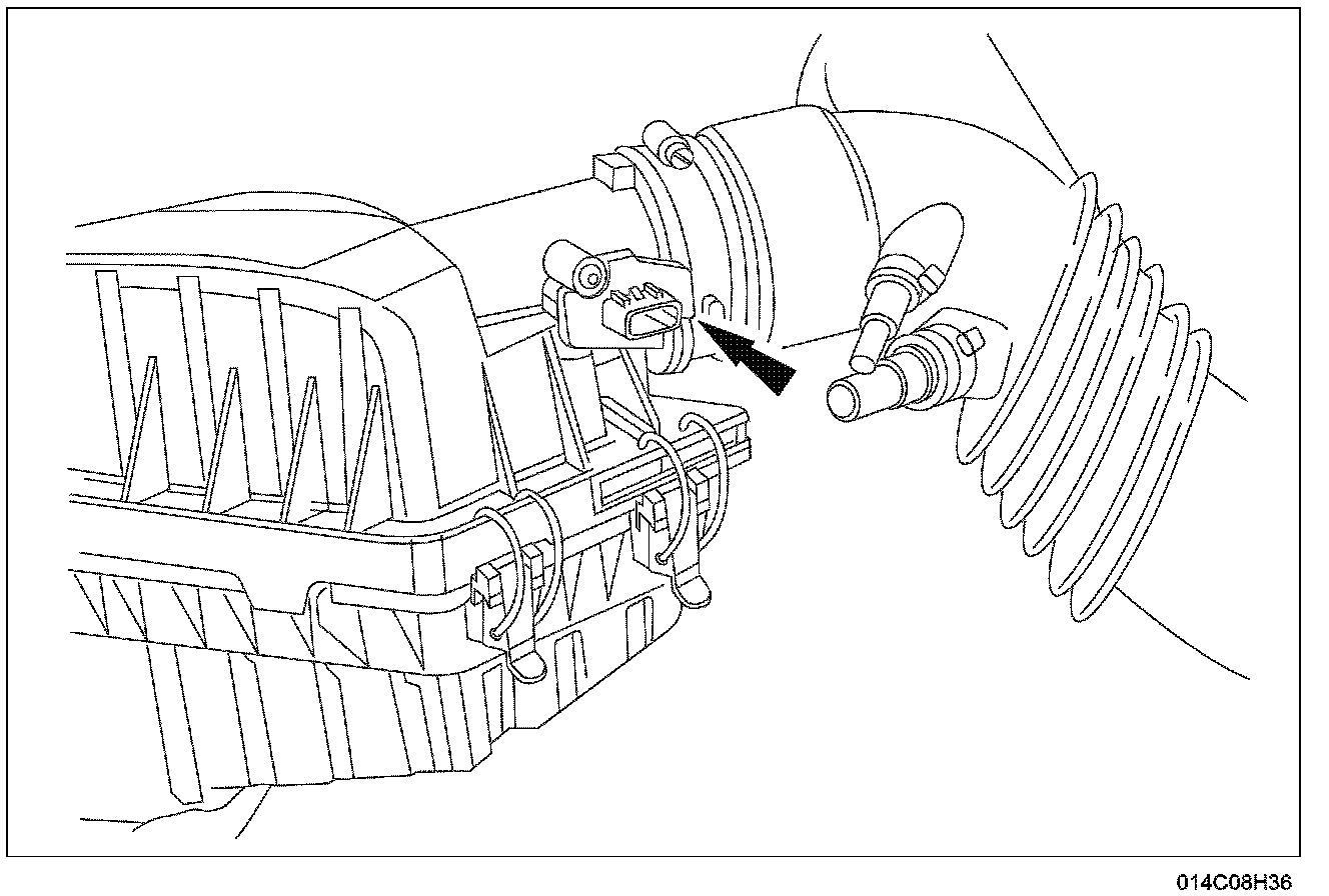 The MAF sensor is located between the air cleaner and the throttle body inside the air cleaner assembly.