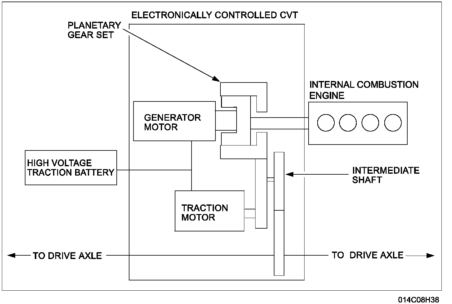 The hybrid electric system consists of 3 key components: the internal combustion engine, the electronically controlled continuously variable transaxle (CVT), and the high voltage traction battery. In this powertrain configuration, there are 2 power sources that are connected to the driveline: a combination of the engine and the generator which uses a planetary gear set to connect to each other, and the electric traction motor which is connected to the drive wheels.