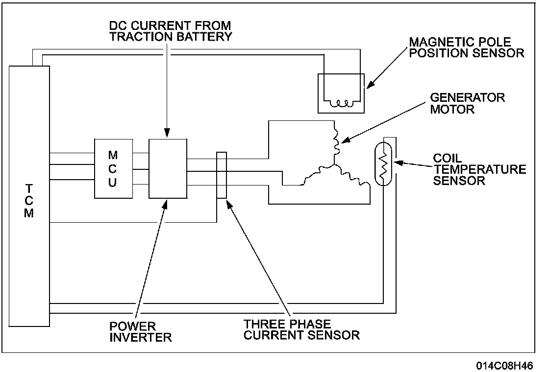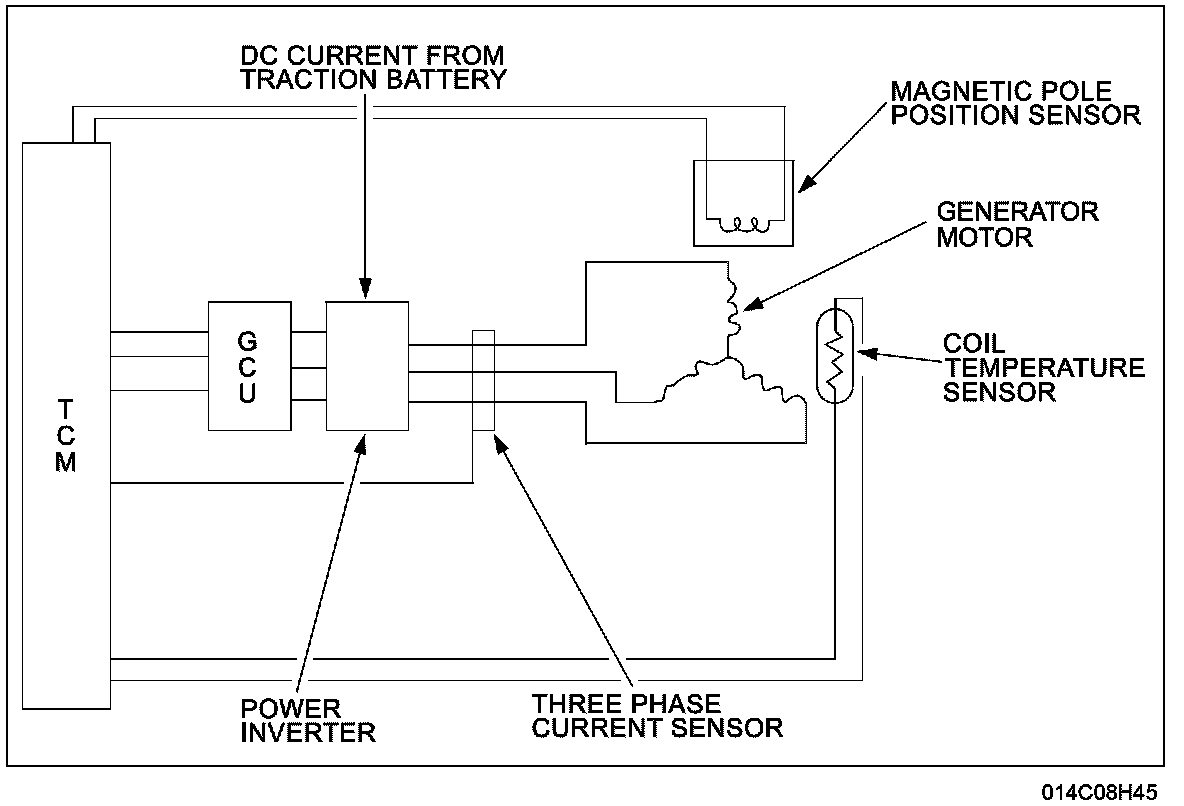 - The generator power inverter (internal to the transaxle) receives a DC current from the high voltage traction battery. The DC current is inverted to an AC current, which is controlled by the TCM and the generator control unit (GCU).