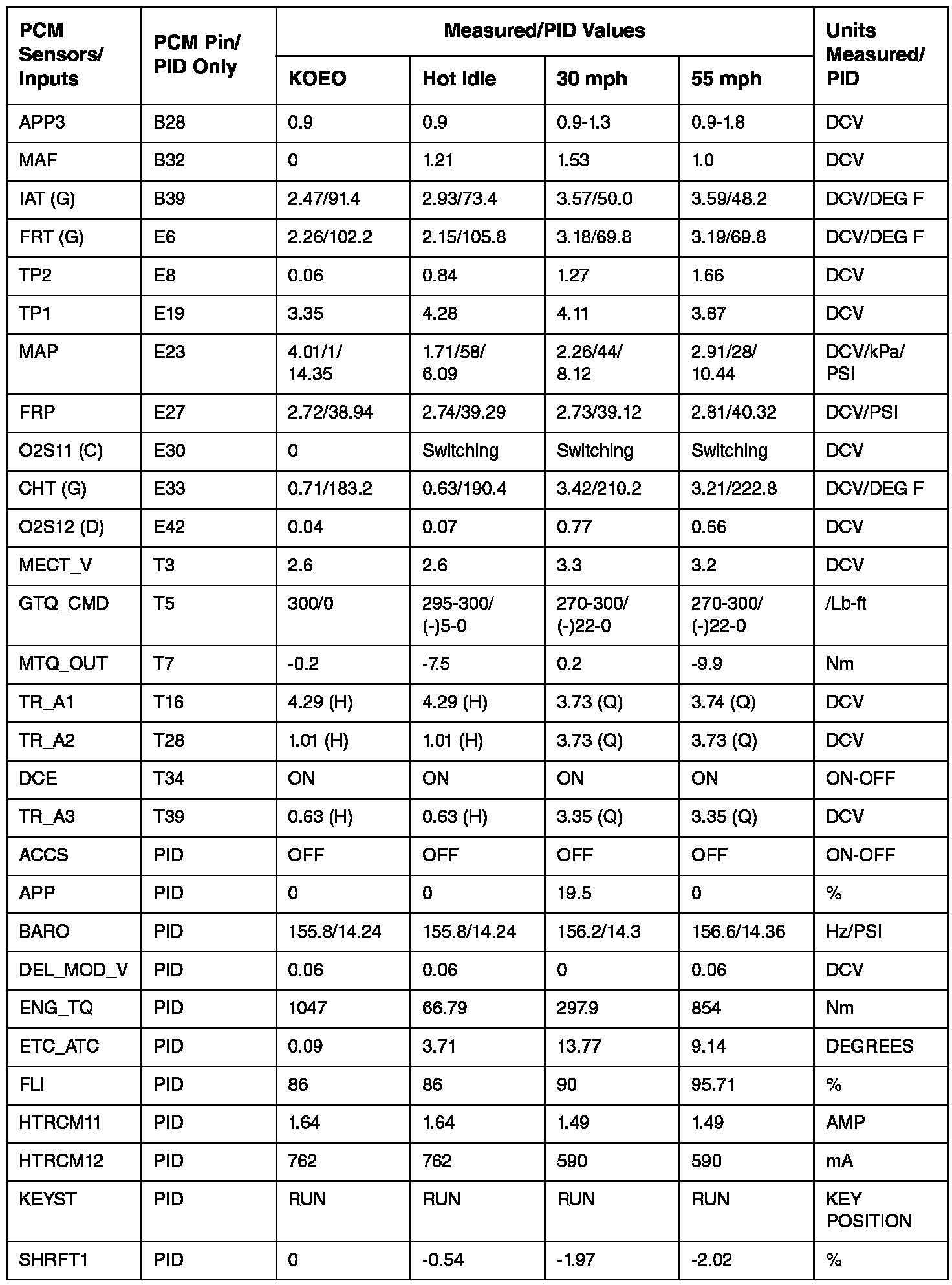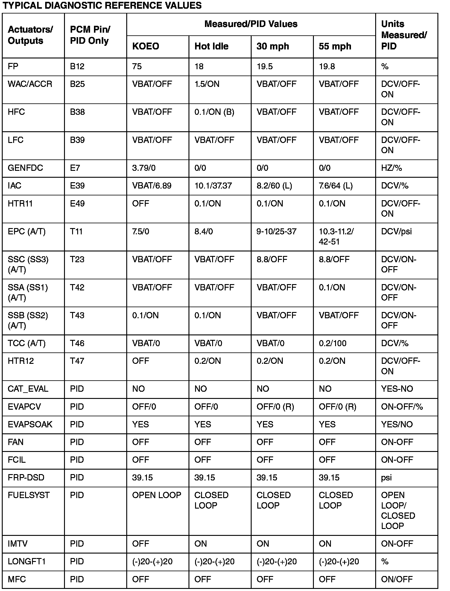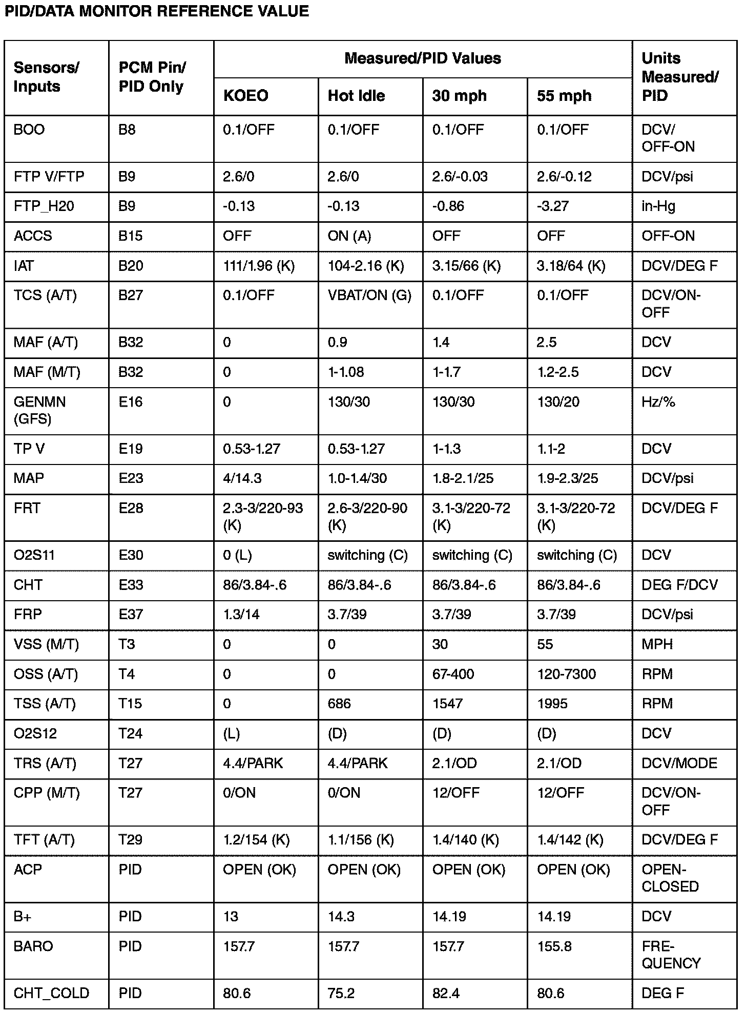 PCM DIAGNOSTIC REFERENCE VALUES
