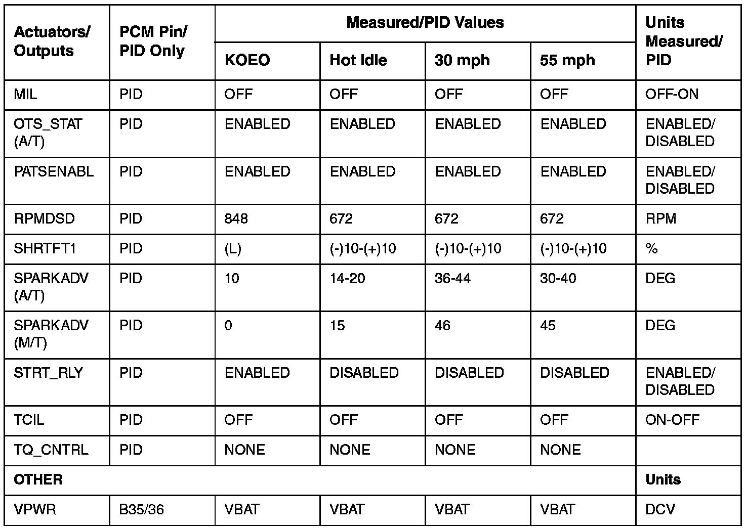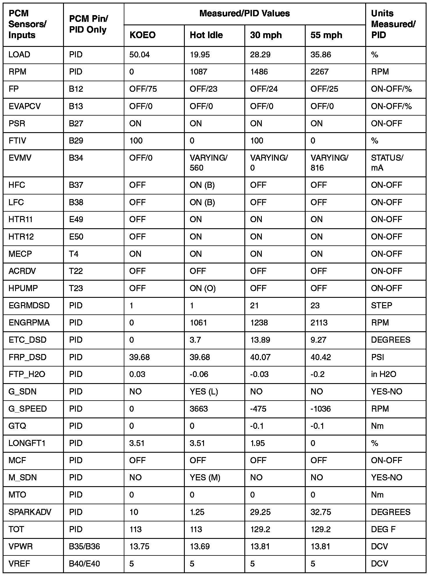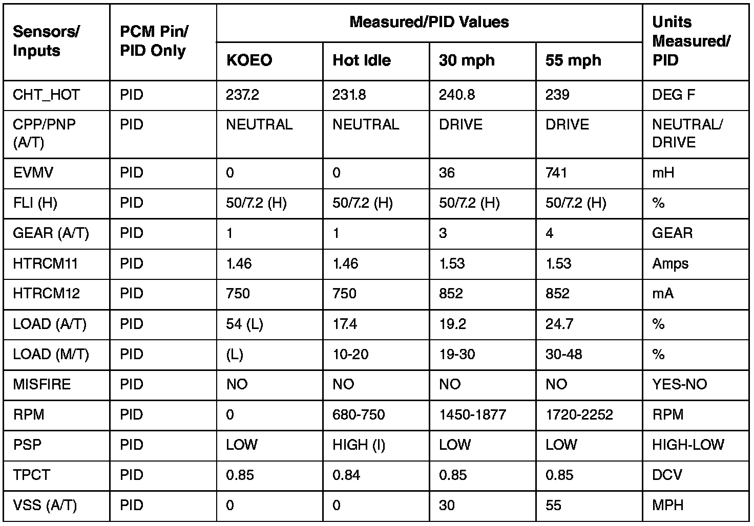 PCM DIAGNOSTIC REFERENCE VALUES