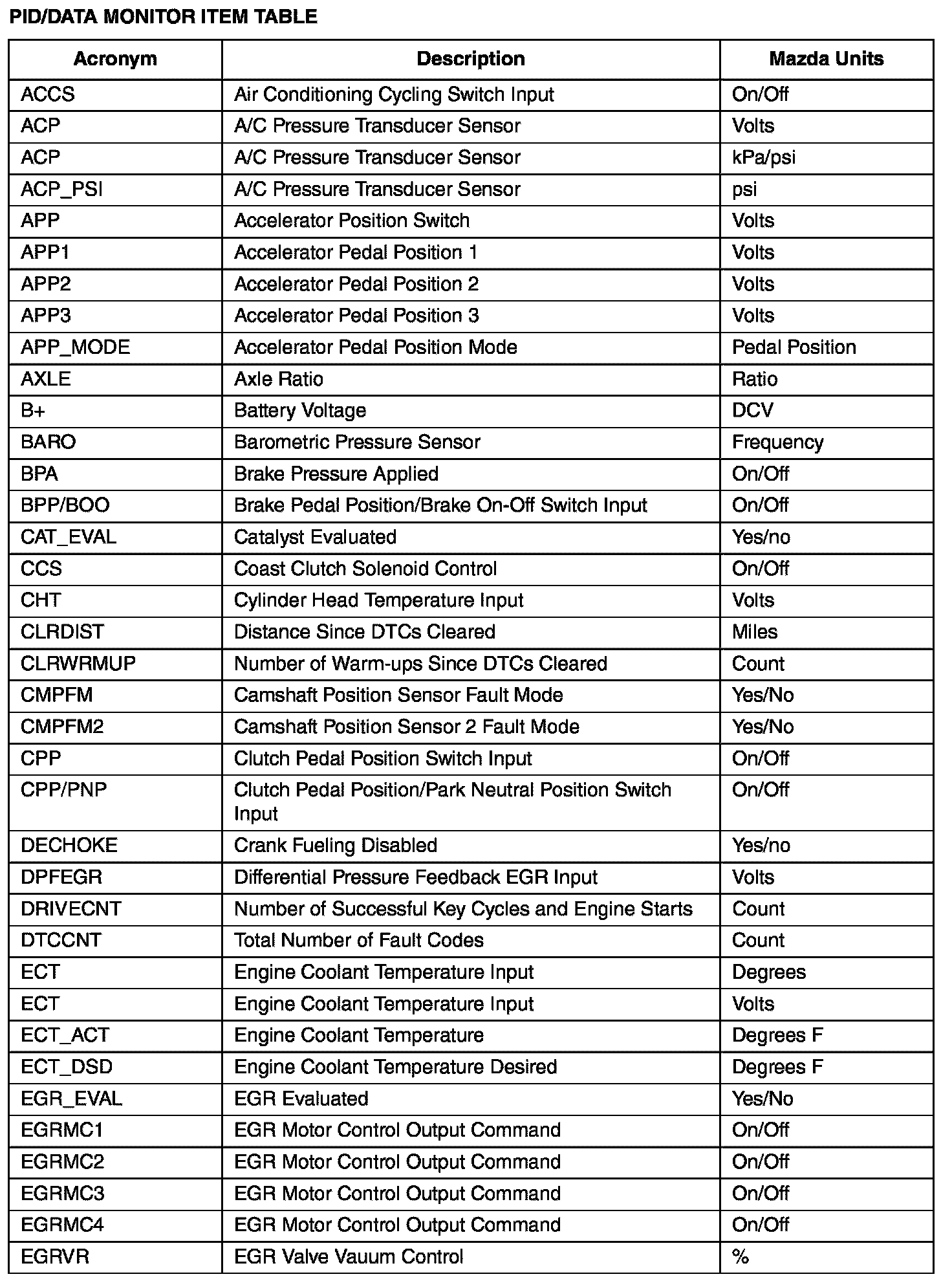 PID/DATA MONITOR ITEM TABLE