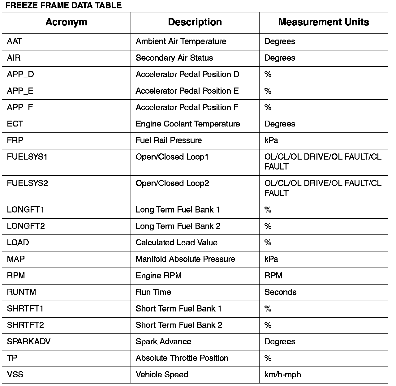 FREEZE FRAME DATA TABLE