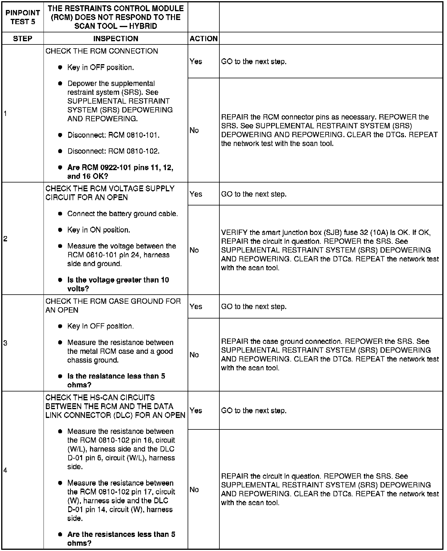 PINPOINT TEST 5: THE RESTRAINTS CONTROL MODULE (RCM) DOES NOT RESPOND TO THE SCAN TOOL - HYBRID