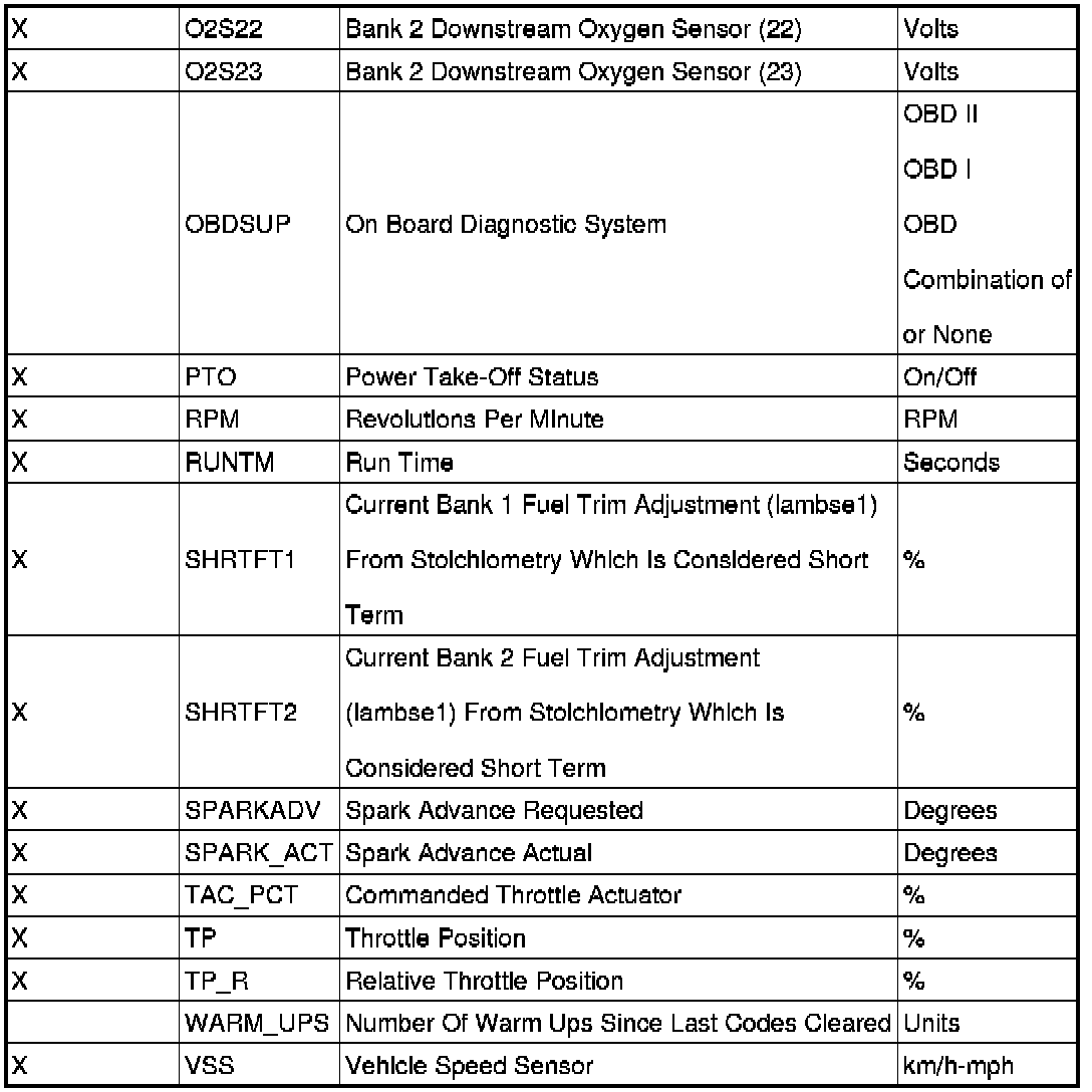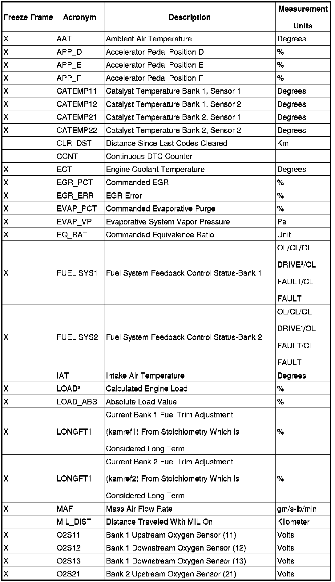 An X in the Freeze Frame column denotes both a mode 1 and mode 2 PID (real time and freeze frame).
