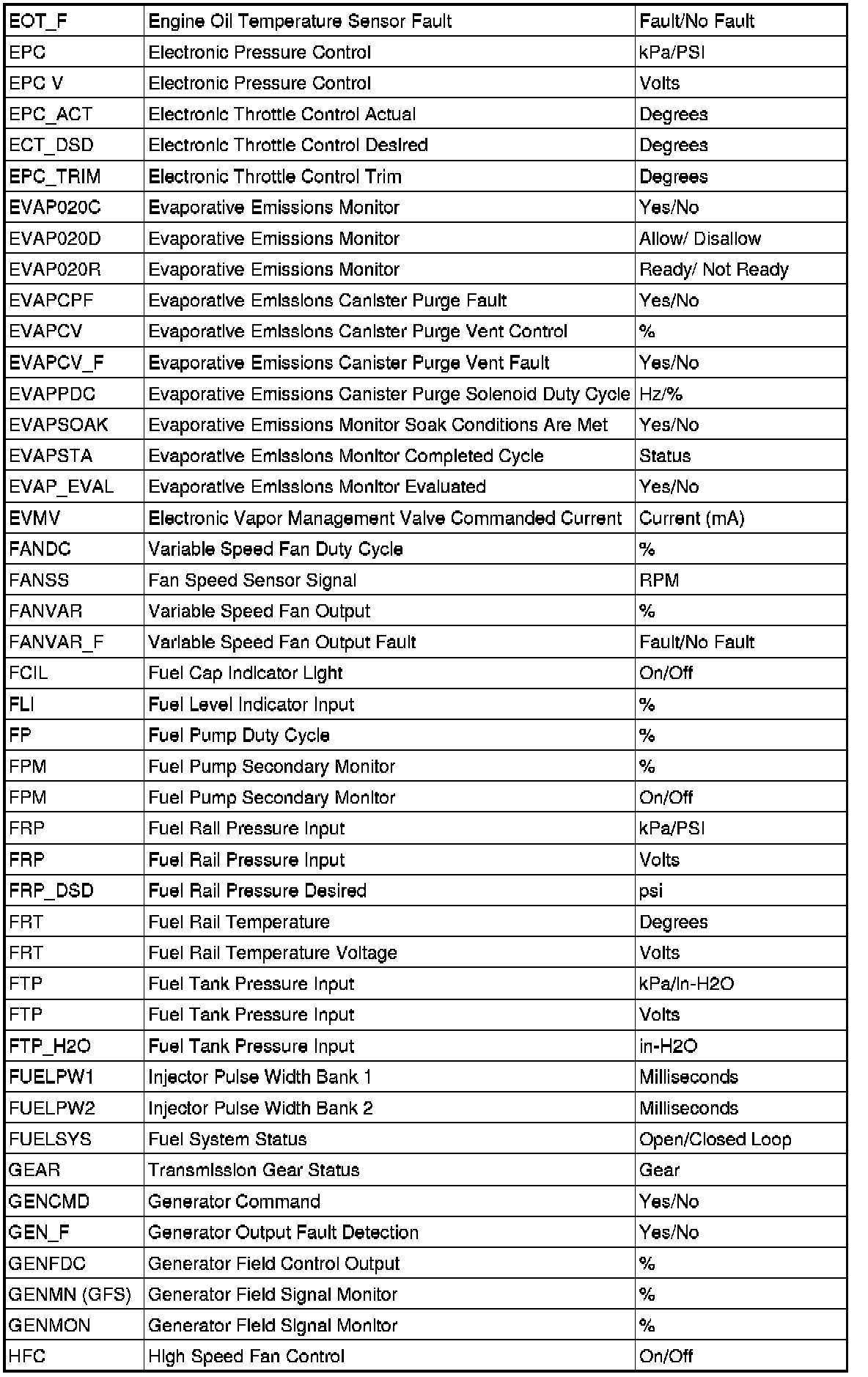 Generic OBD PID List (Part 1):