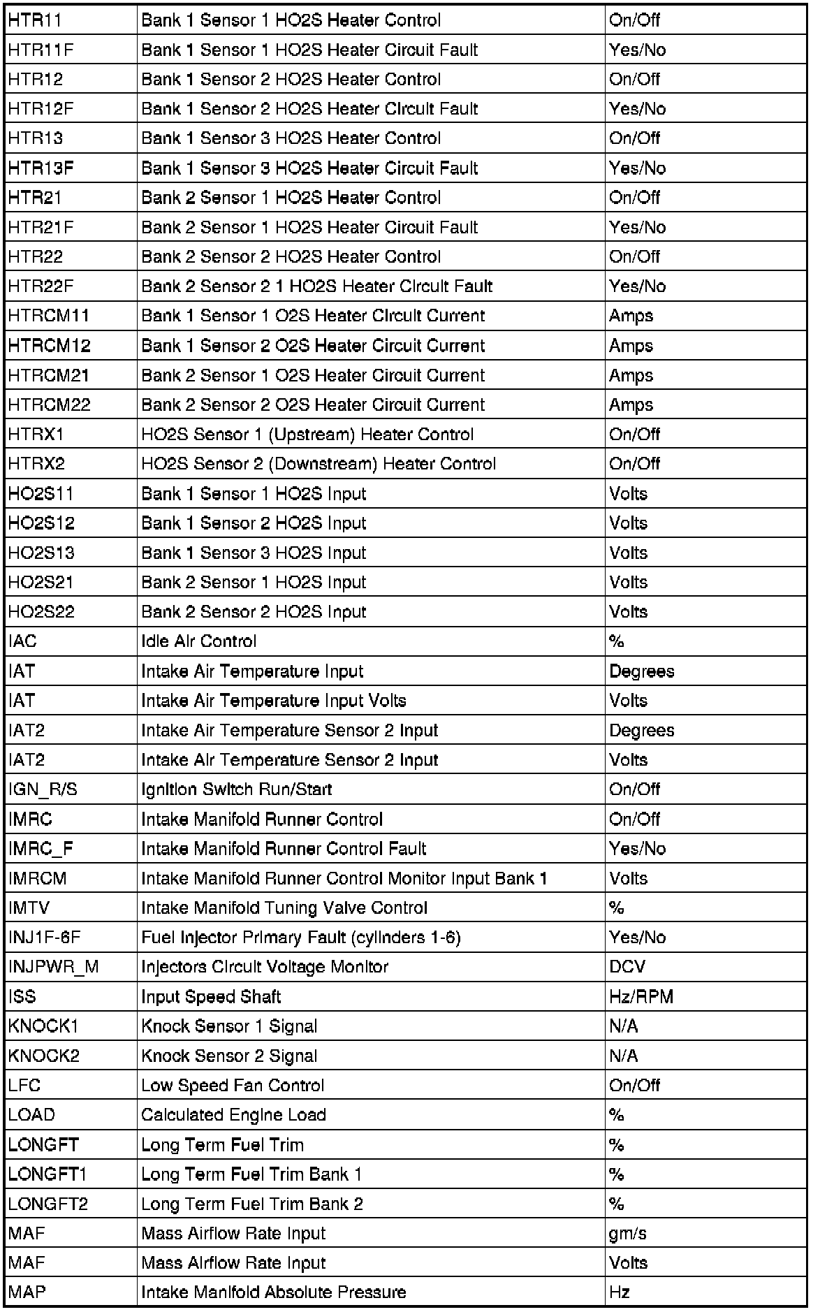 1PID/DATA MONITOR ITEM TABLE