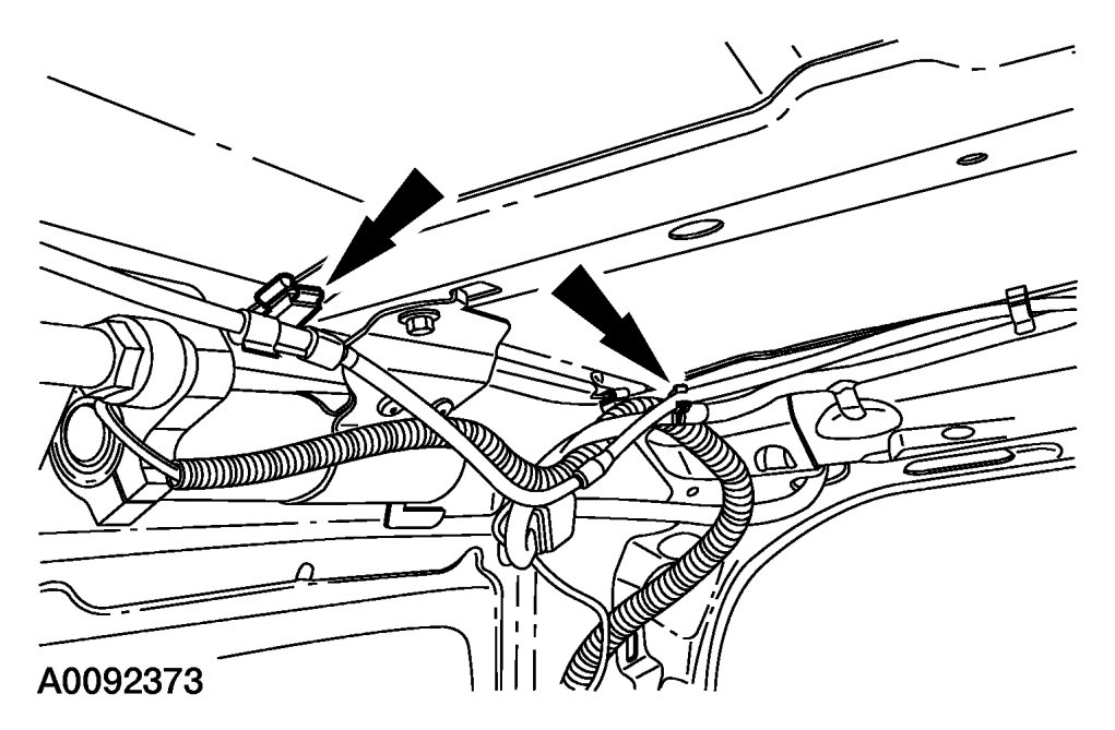 - If equipped with a moonroof and or rear window wiper assembly, note position and routing of the moonroof front drain hose and/or rear window washer solvent hose for installation purposes.