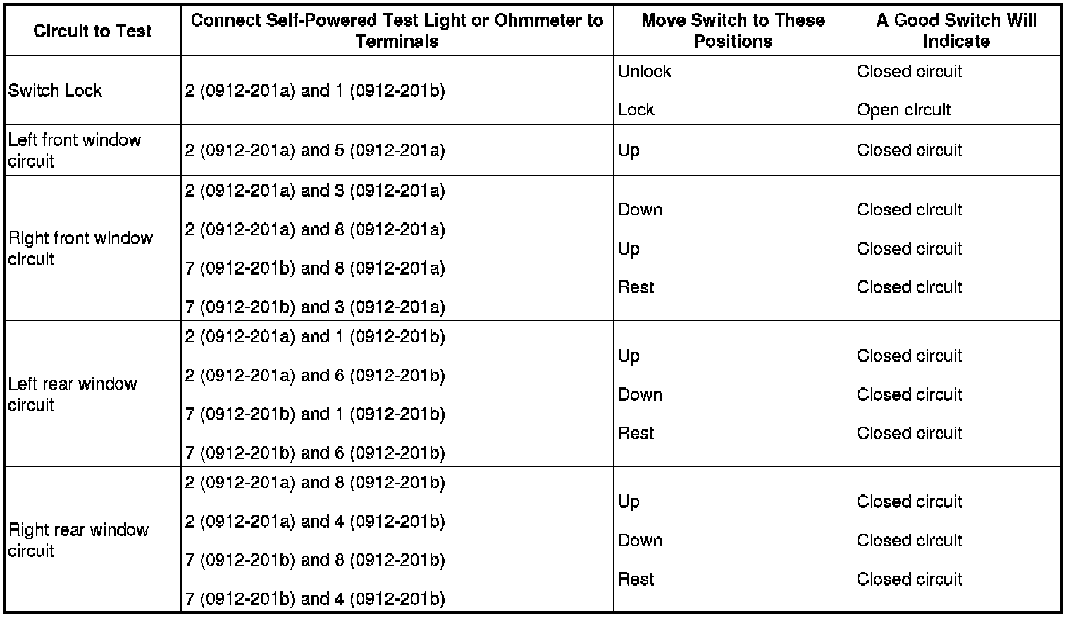 2. Inspect for continuity between the window control switch terminals using a self-powered test light or an ohmmeter.