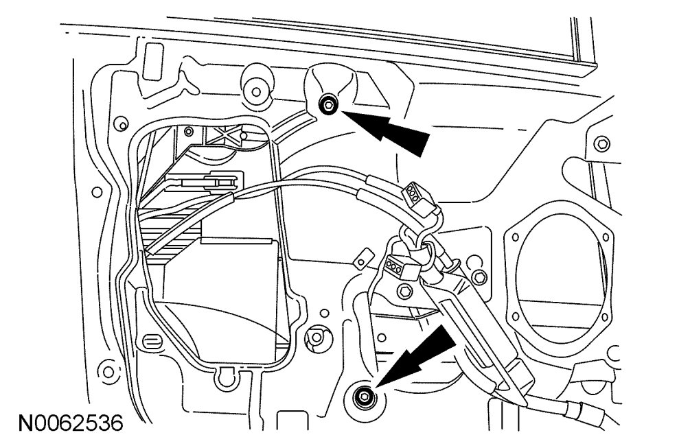 12. Loosen the 2 front door window regulator and motor bolts