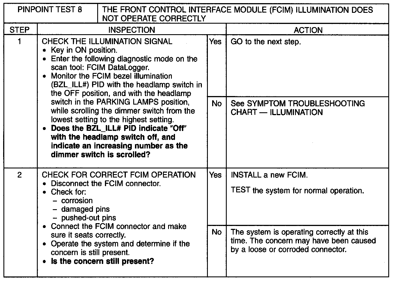 Pinpoint Test 8: The Front Control Interface Module (Fcim) Illumination Does Not Operate Correctly