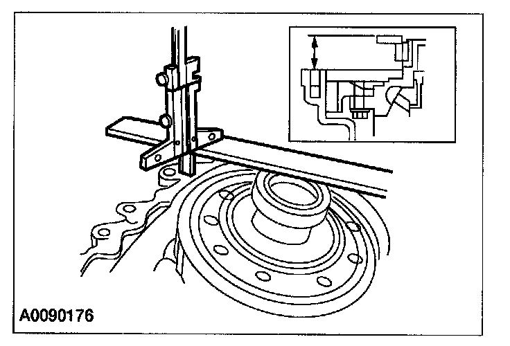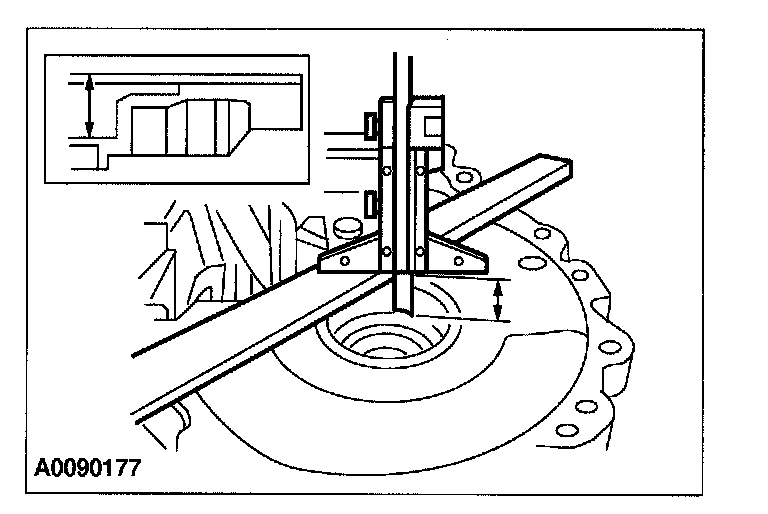 50. Using a depth micrometer and a straightedge, measure and record the depth from the mating surface of the clutch housing to the input shaft bearing outer race outer surface. Record this measurement as L2.