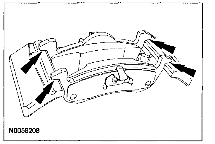 1. Clean, dry and inspect the brake caliper anchor plate. Apply a light coat of specified lubricant to the 4 brake pad contact points on the anchor plate.