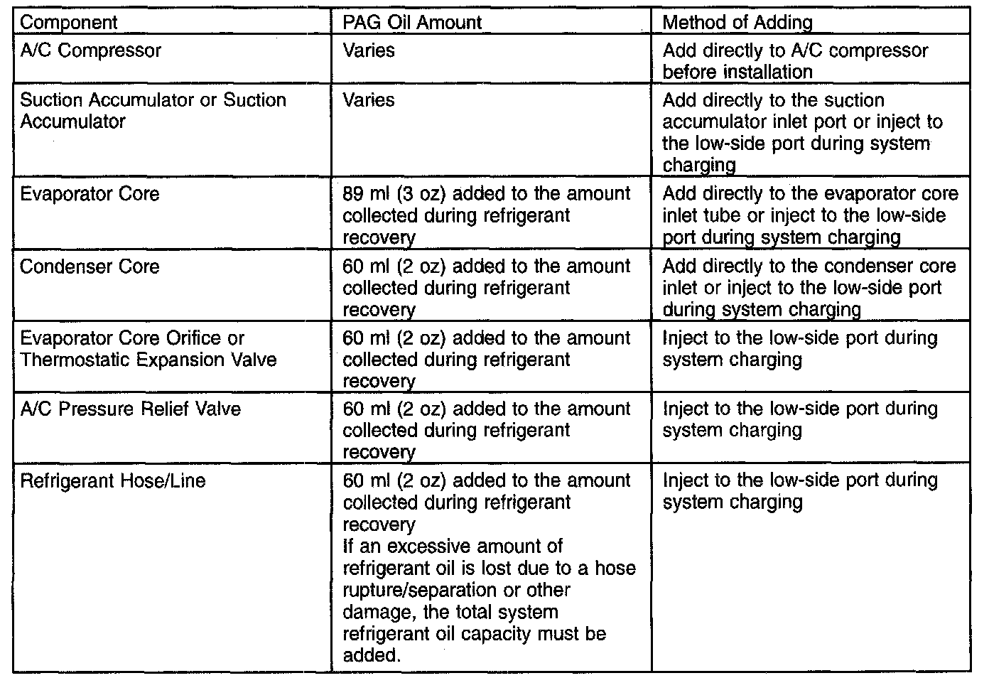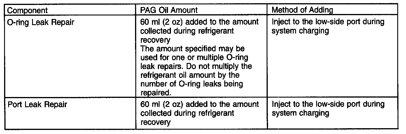 REFRIGERANT OIL ADDINGCAUTION: During normal A/C operation, oil is circulated through the system with the refrigerant, and a small amount is retained in each component. If certain components of the system are removed, some of the refrigerant oil will go with the component. To maintain the original total oil charge, it is necessary to compensate for the oil lost by adding oil to the system with the new part.