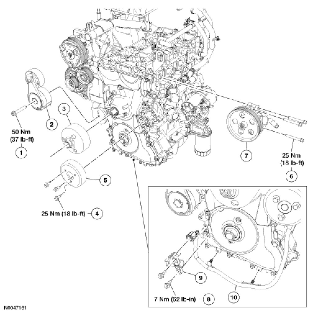 CAUTION:The crankshaft, the crankshaft sprocket and the pulley are fitted together by friction, with diamond washers between the flange faces on each part. For that reason, the crankshaft sprocket is also unfastened if you loosen the pulley. Therefore, the engine must be retimed each time the damper is removed. Otherwise severe engine damage can occur.Install the crankshaft pulley. See - Service and Repairand hand-tighten the bolt.