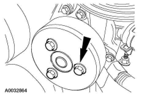 CAUTION:There is one bolt behind the cooling fan drive pulley. This bolt can be accessed by lining up one of the holes in the pulley with the bolt.