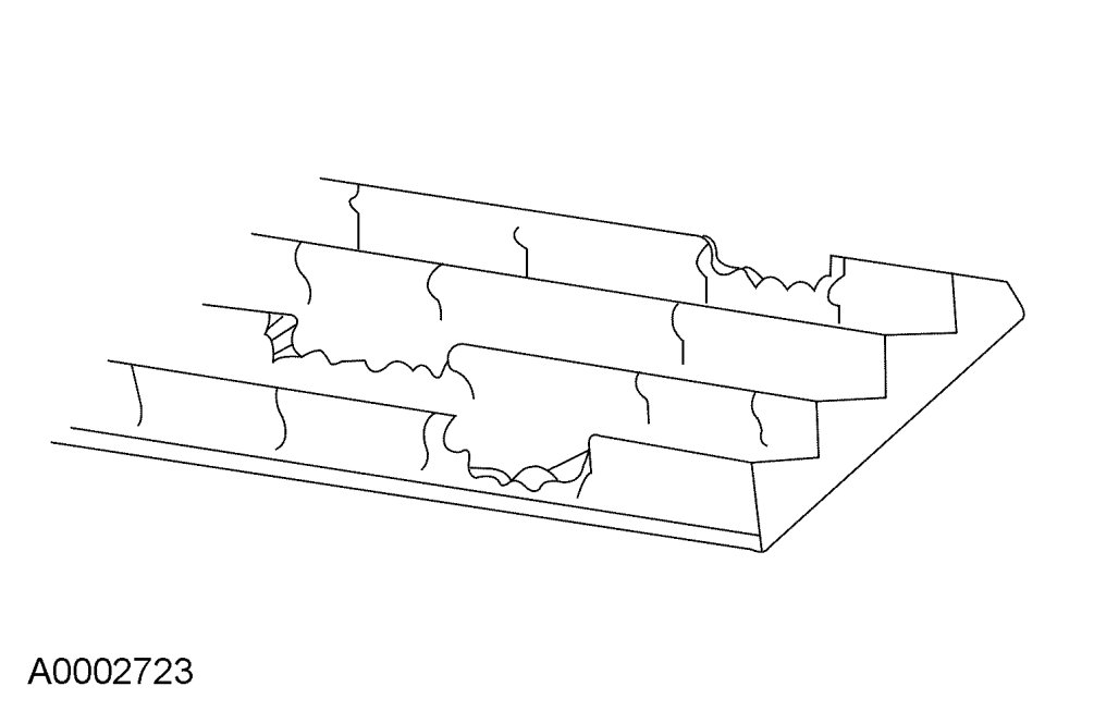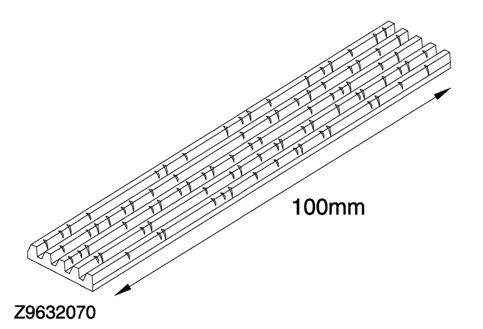 NOTE:Up to 15 cracks in a rib over a distance of 100 mm (3.93 in) can be considered acceptable. If damage exceeds the acceptable limit or any chunks are found to be missing from the ribs, a new belt must be installed.