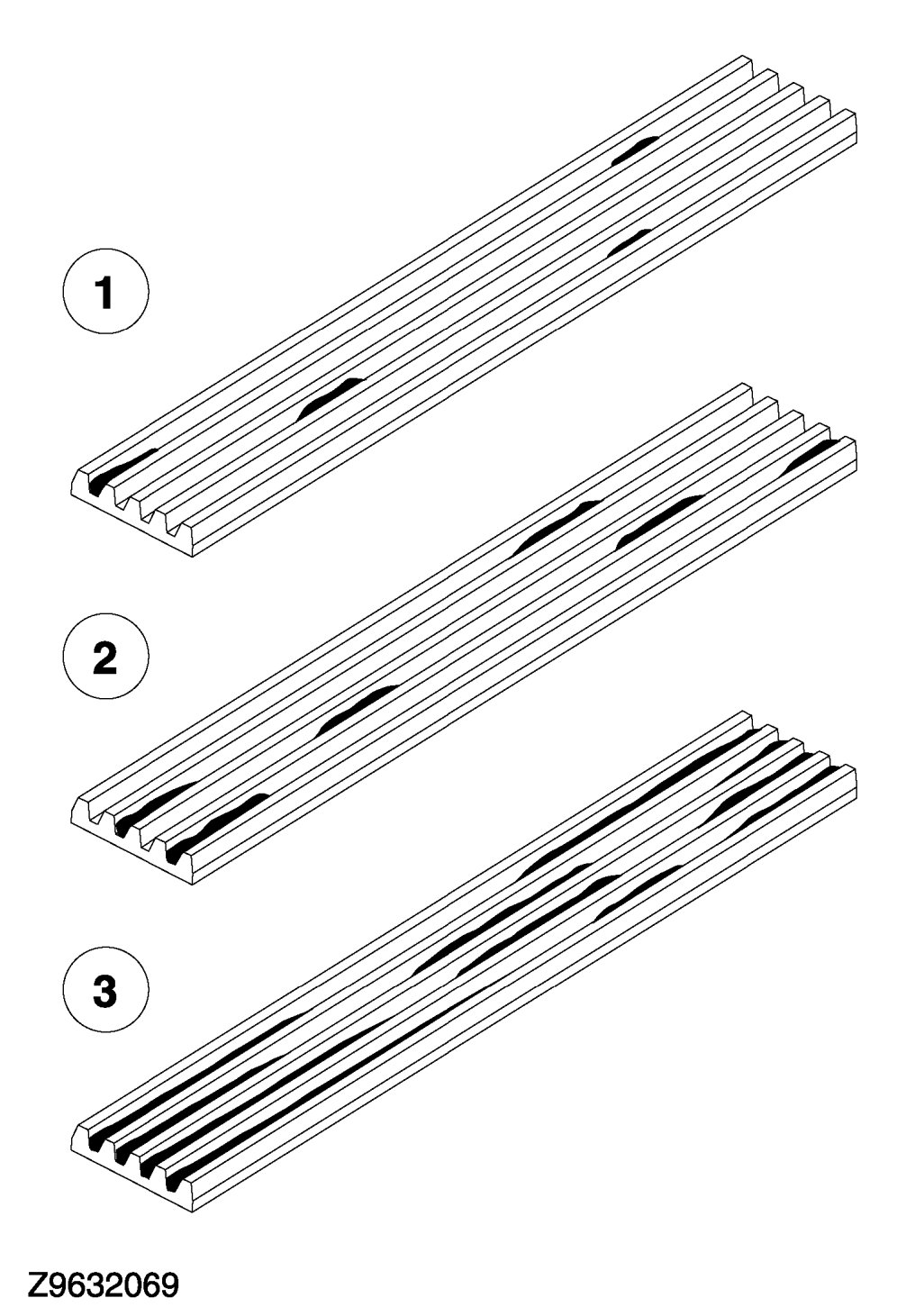 c. Heavy deposits building up along the grooves resulting in a possible noise and belt stability concern. If heavy deposits are apparent, install a new belt.