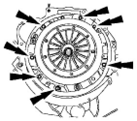 CAUTION:If the clutch disc and clutch cover are to be reinstalled, remove the bolts evenly or permanent damage to the diaphragm spring will occur resulting in complete clutch release.