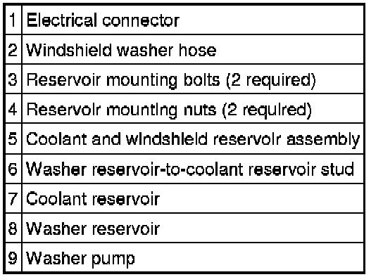 NOTE:The windshield washer reservoir and the washer pump are serviced independently.Remove the 2 reservoir bolts and 2 reservoir nuts.