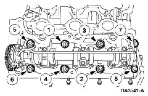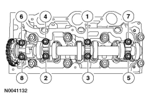LH cylinder headNOTE:Cylinder head bolts are a torque-to-yield design. New bolts must be installed.Install the eight 12 mm (0.47 in) bolts and tighten in the sequence shown in two stages.