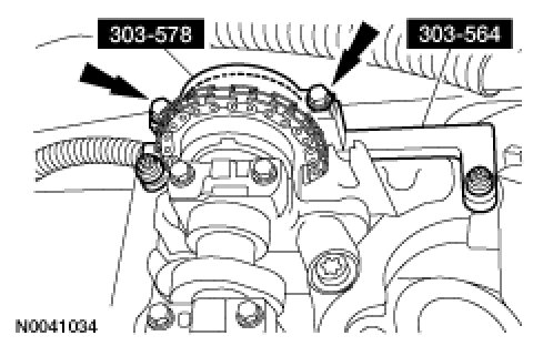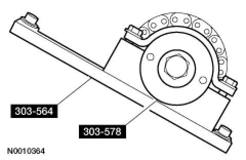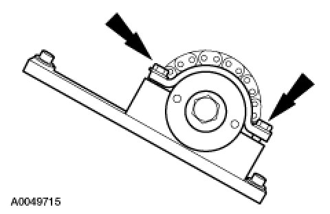 NOTE:Late build vehicles shown, early build vehicles similar.Install the camshaft sprocket holding tool SST and the adaptor SST to the RH cylinder head and tighten the 2 top clamp bolts.Tightening Torque10 Nm {1.0 kgf-m, 89 in-lbf}
