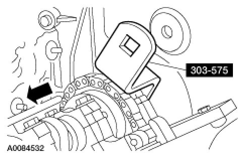 CAUTION:The RH camshaft sprocket bolt is a LH-threaded bolt.Using the torque wrench extension SST with the camshaft sprocket nut socket SST (303-565), loosen the RH camshaft sprocket bolt.