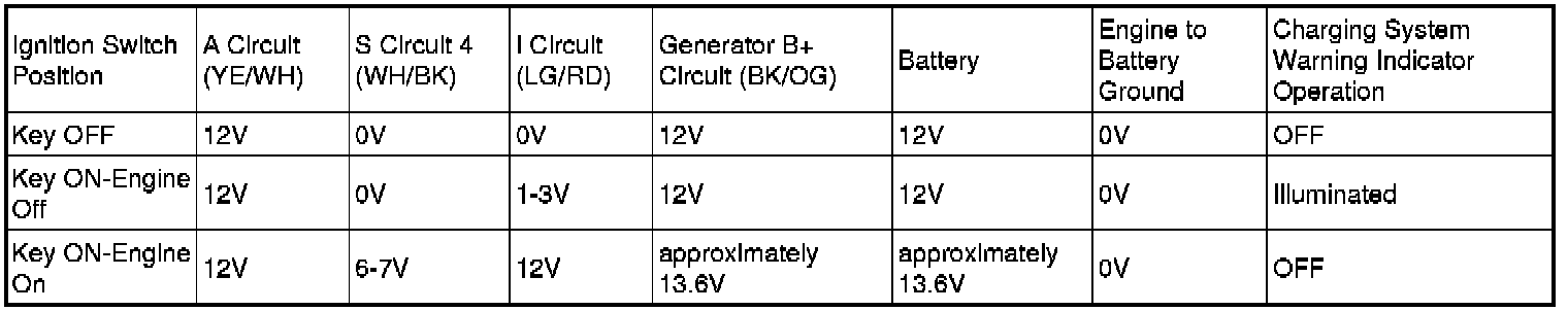 5. Check the battery voltage before and after starting the engine to determine if the battery voltage increases. See the following chart.Normal Charging System Voltages