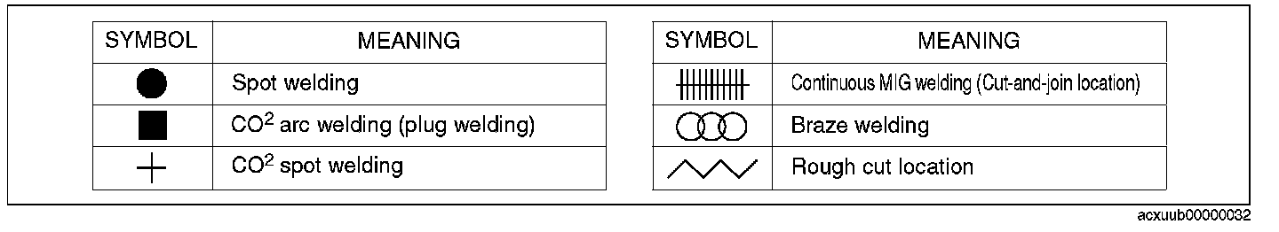 The 6 symbols are used to indicate the type of weld that is used when replacing body panels.
