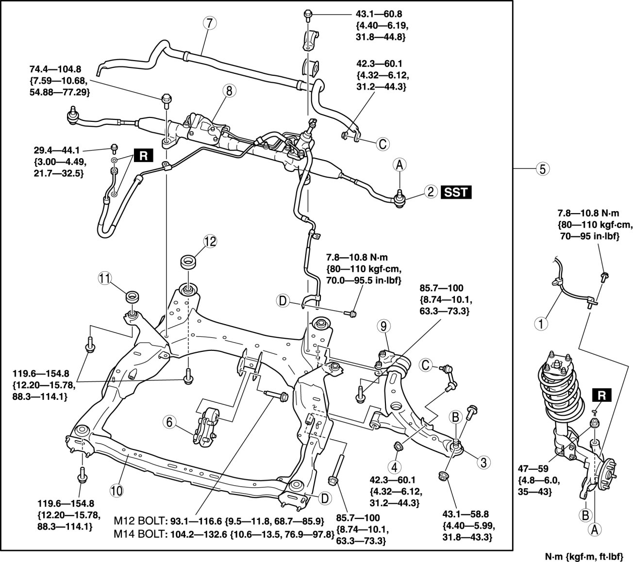 - For bolt D (M12): 86.1-95.1 Nm {8.8-9.6 kgf-m, 63.5-70.1 ft-lbf}