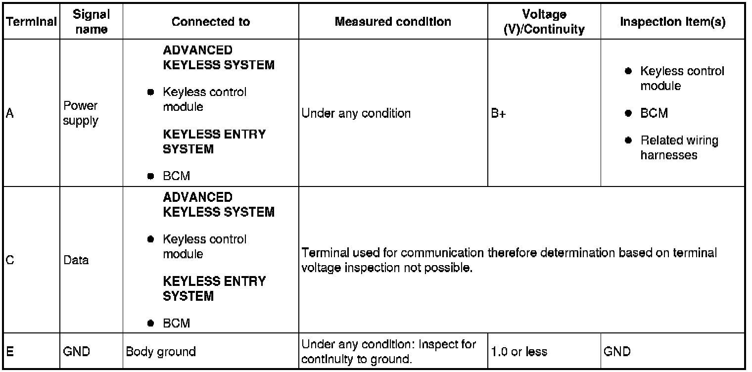 2. If the system does not work properly even though the inspection items or related wiring harnesses do not have any malfunction, perform symptom troubleshooting [KEYLESS ENTRY SYSTEM].