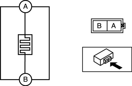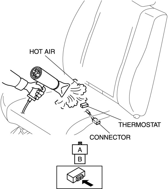 3. While inspecting for continuity between the connector terminals A and B, use a dryer to warm the thermostat of the seat warmer unit on seat cushion.