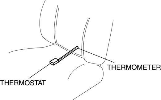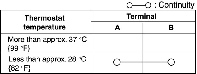 6. Using an ohmmeter, verify that there is continuity between the seat warmer unit connector terminals when temperature drops to approx. 28 °C {82 °F}.
