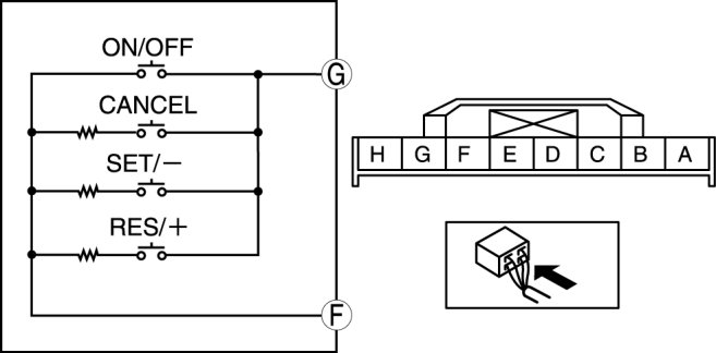 4. Inspect for resistance and continuity between cruise control switch terminals G-F using a tester.