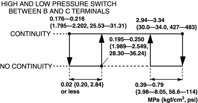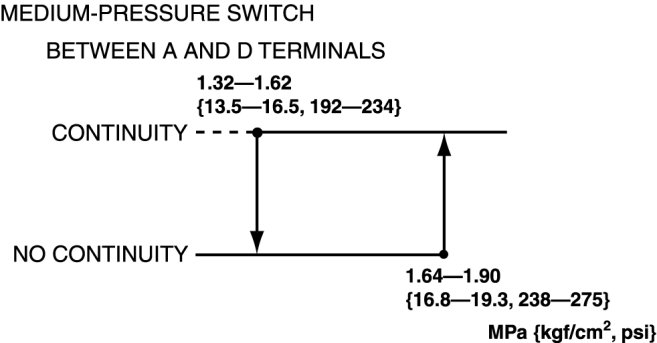 3. Verify the high-pressure side reading of the manifold gauge and continuity between the terminals of the refrigerant pressure switch.