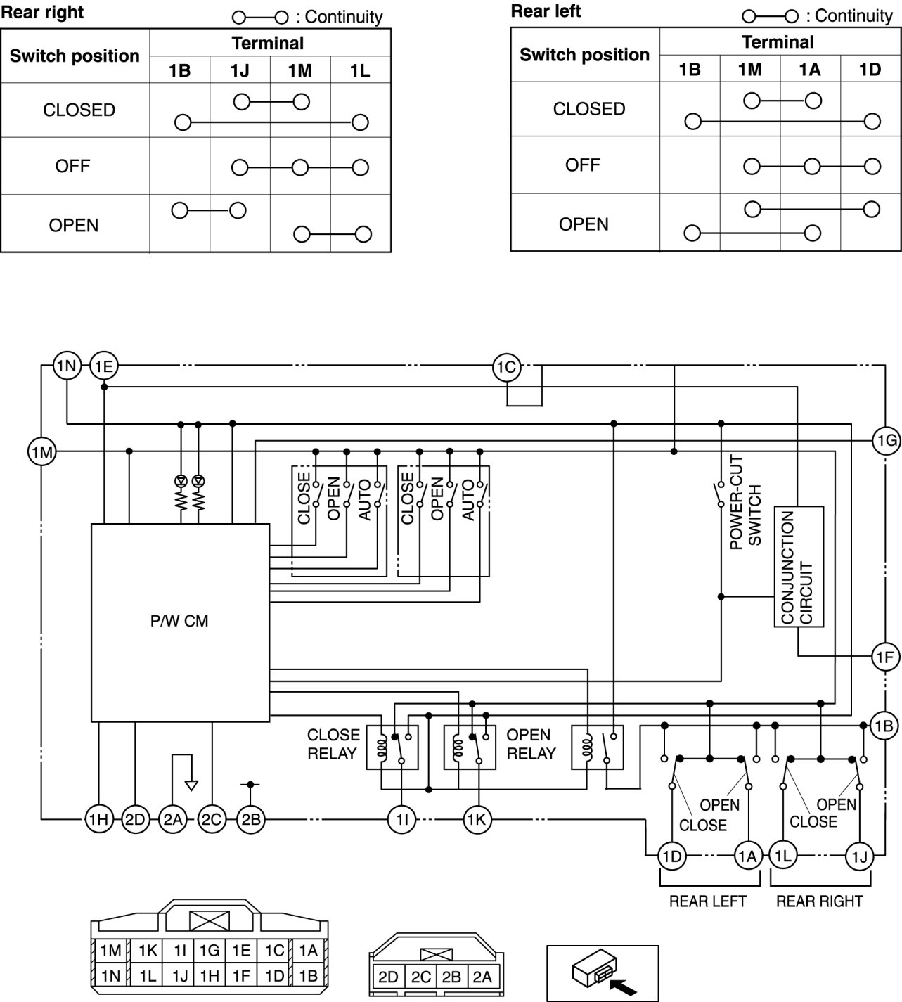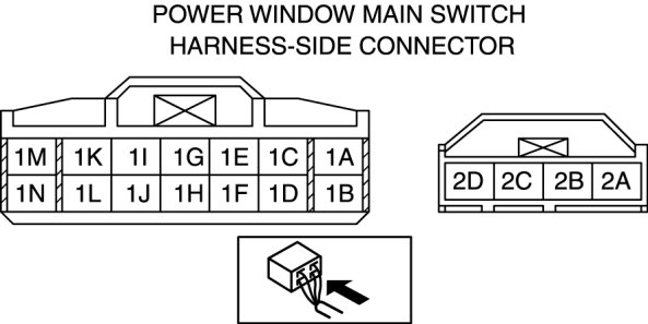 3. Inspect the power window main switch connector for continuity at terminal 1M and 2A.