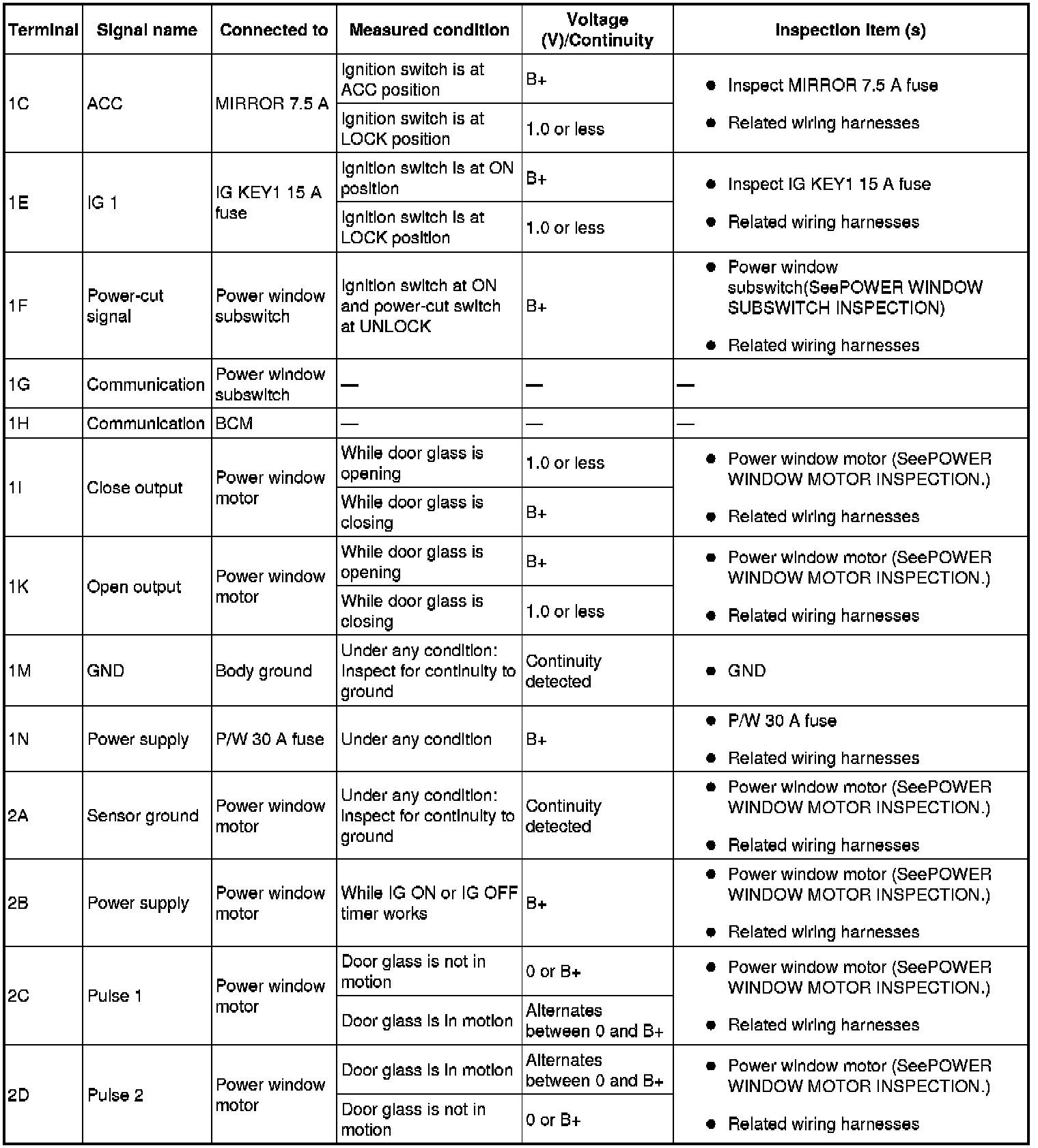 - If the voltage is not as specified in the Terminal Voltage Table, inspect the parts under "inspection item(s)" and related wiring harnesses.