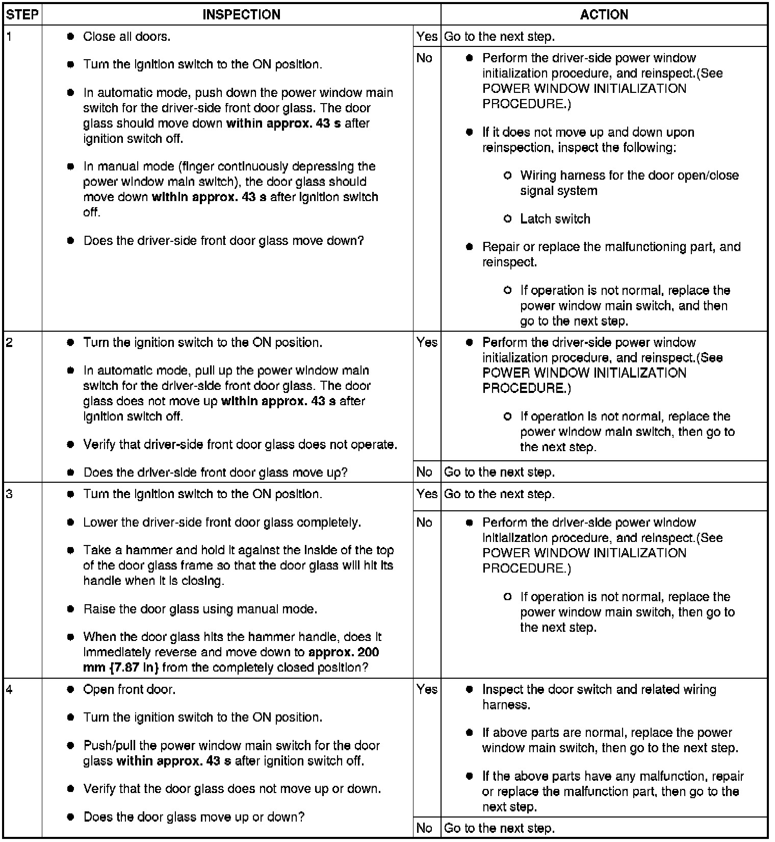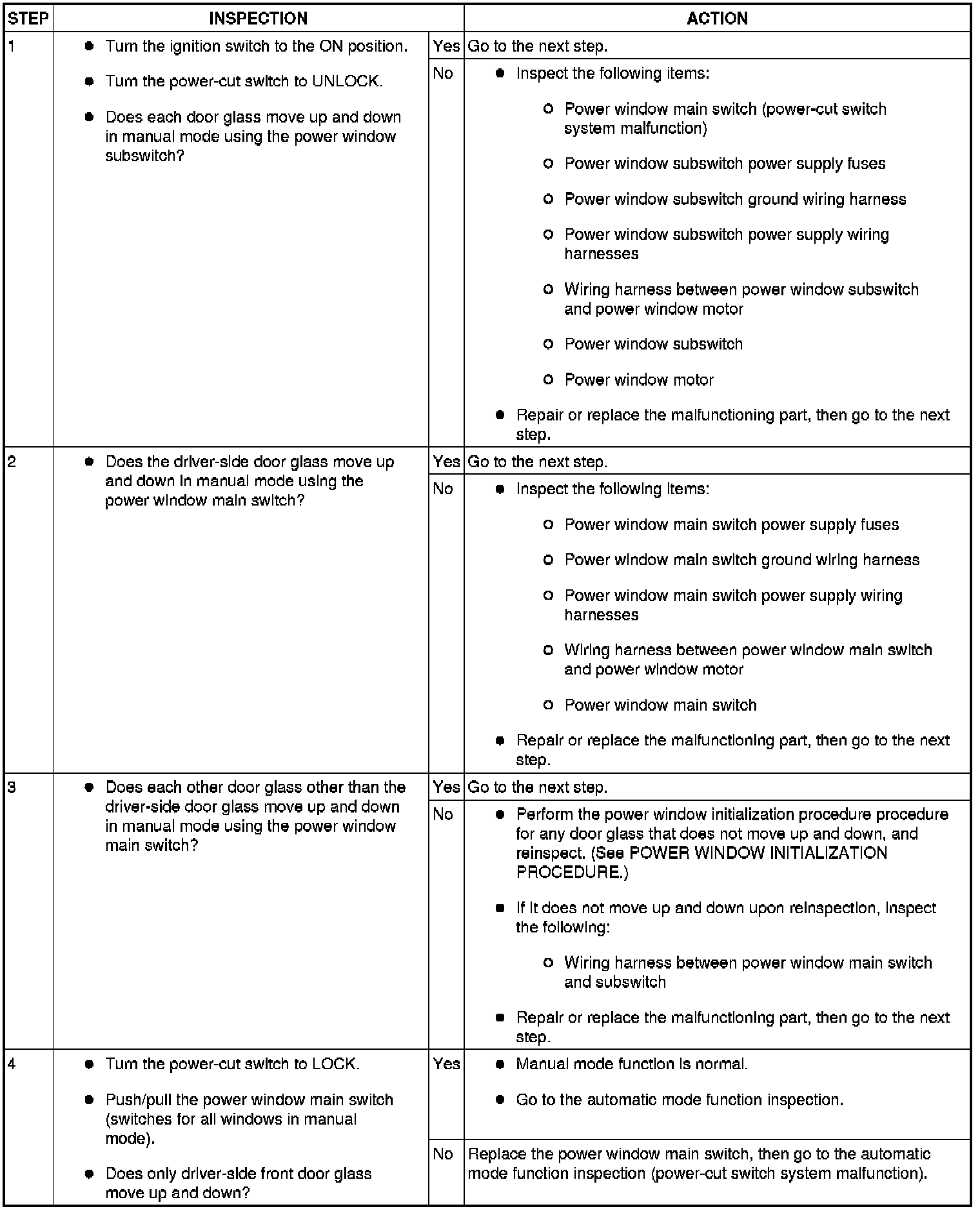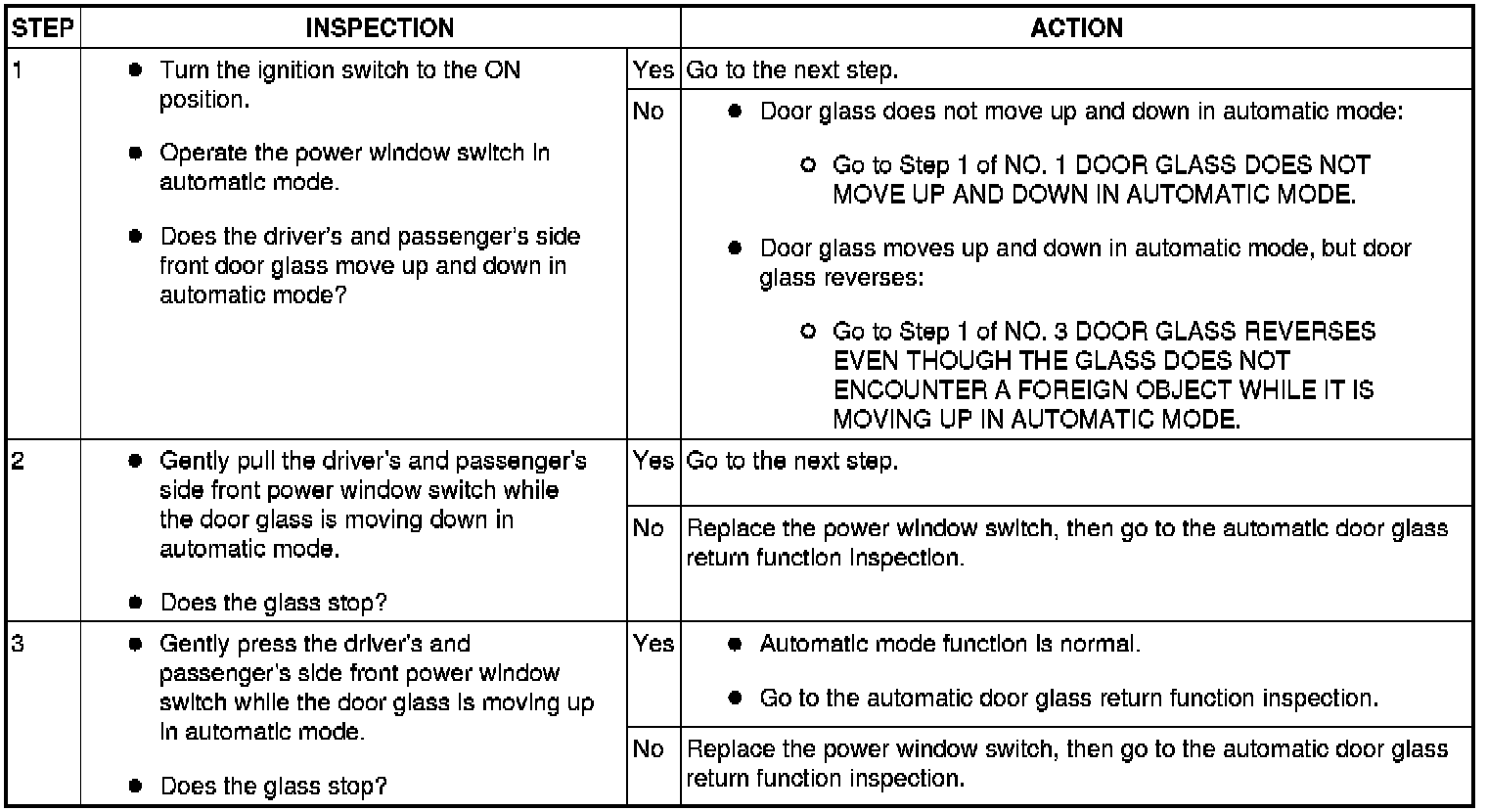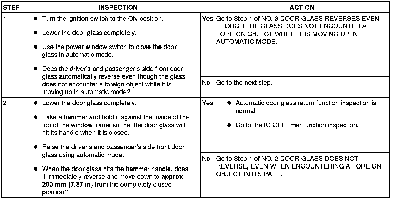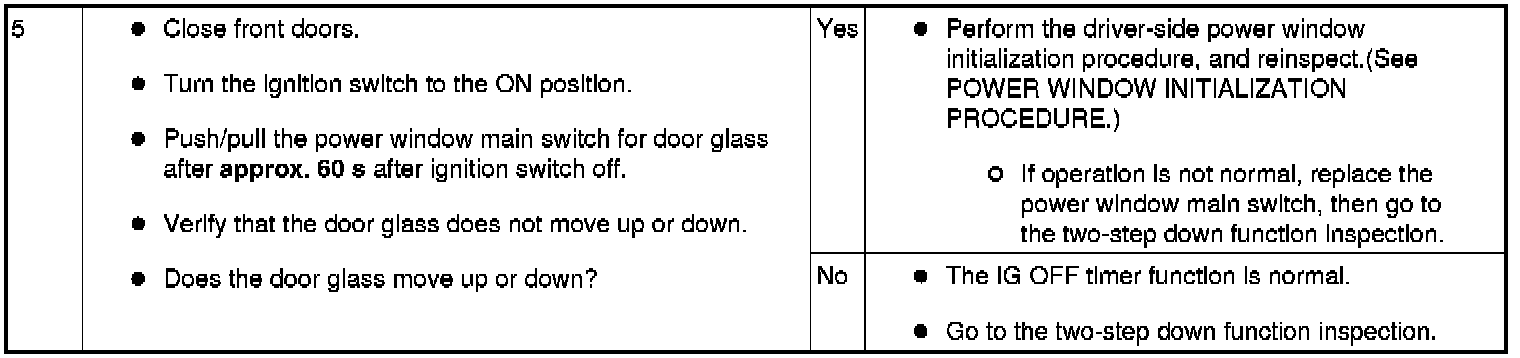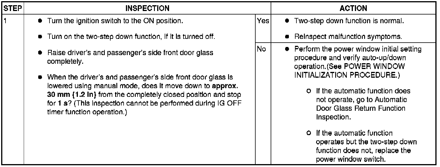 - Before inspecting the two-step down function, make sure that the two-step down function is turned on (if the two-step down function is turned off, the power window close not stop once.).