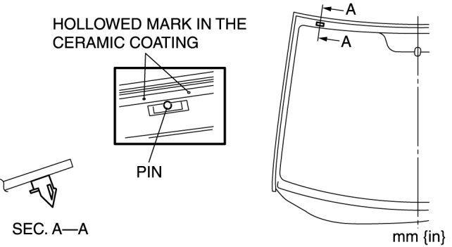 4. Align the marks made before removal and install the pin to the windshield referring to the figure. (when reusing the glass, and the pin was removed)