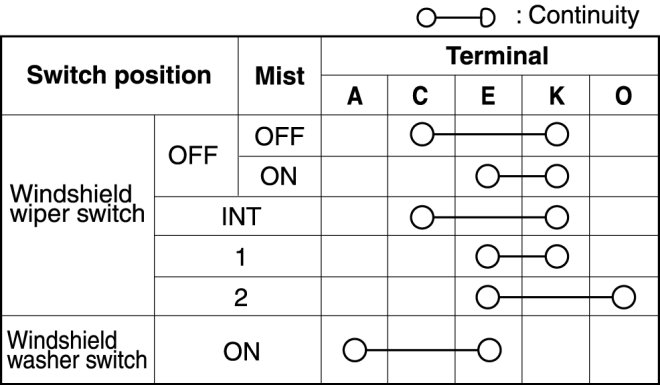 1. Verify that the continuity between the windshield wiper and washer switch is as indicated in the table.