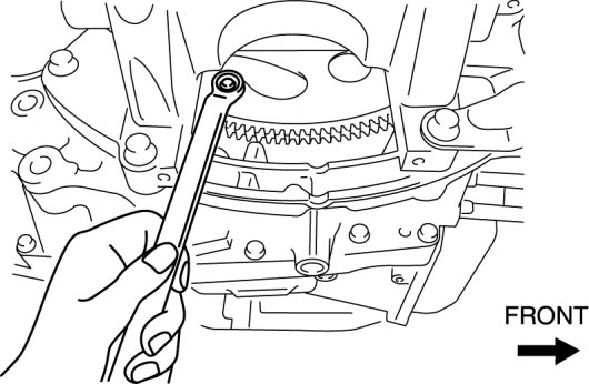 Crankshaft Pulley Lock Bolt Installation Note1. Rotate the crankshaft clockwise, and set a wrench to the drive plate bolt at the position shown in the figure to lock the crankshaft rotation.